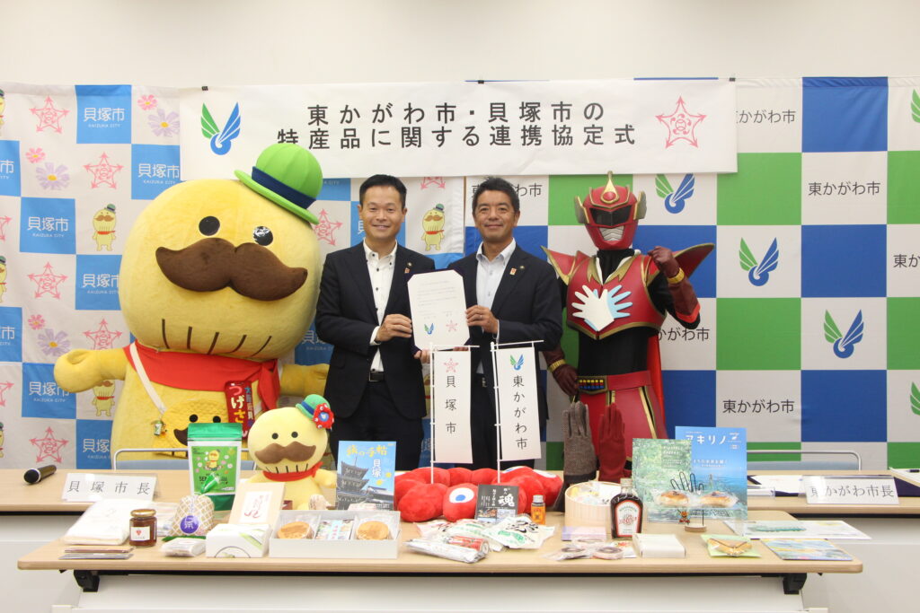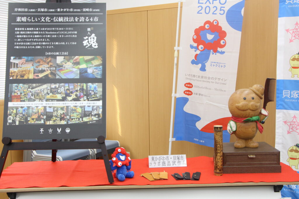 大阪・関西万博での催事「LOCAL JAPAN展(万博首長連合主催)」において共同出展した東かがわ市と貝塚市が、特産品に関する連携協定を締結し、記者会見などが行われました。