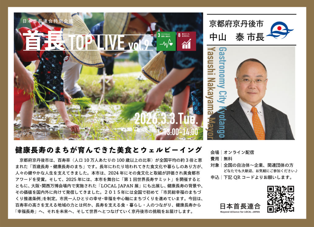 地方創生を通じて、日本の未来社会を創造する首長連合(以下「日本首長連合」)は、2026年3月3日にオンライン開催で、全国各地の首長が自ら「地域の今」を語る、首長TOP LIVE vol.9を開催します。